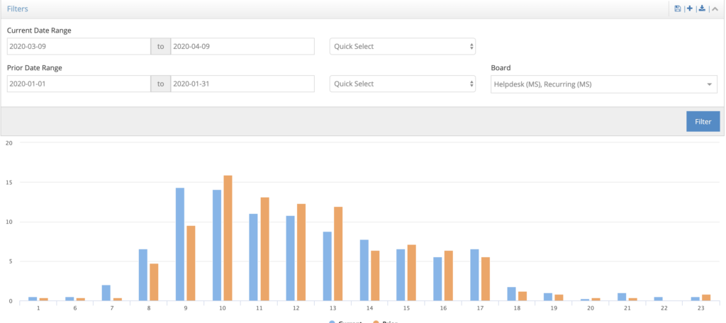 This report allows you to compare two time periods, before TNN and during. You can also filter by service boards to limit the analysis to only reactive tickets. In the example above, after reviewing the report the partner decided to allow some employees to shift their schedules to earlier in the day to handle the early tickets. When we have shared this with other partners we have found some with no change in staffing needs and some where the report reveals the staff is needed later in the day. Do you know how your day has changed? Ticket Entry Times report will be helpful both now and again when we move to the next phase of TNN.